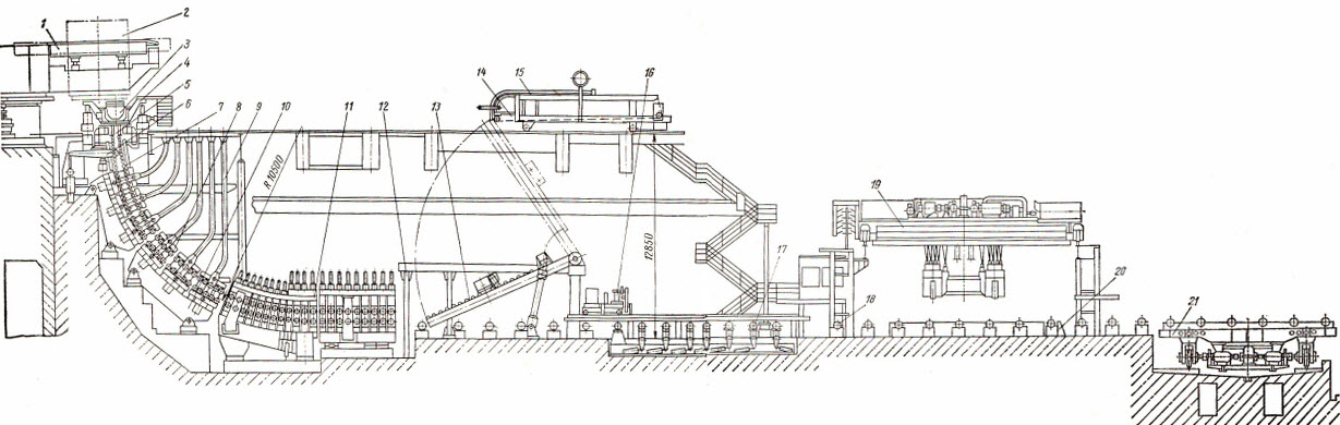 В состав машины входят сталеразливочный стенд 1 для двух ковшей 2, промежуточный ковш 3, установленный на самоходной тележке 4, медный водоохлаждаемый кристаллизатор 5, механизм 6 качания кристаллизатора, неприводная роликовая проводка 7, радиальный участок 10 приводной роликовой проводки с десятироликовыми секциями 8, тянуще-правильная машина 11, машина 14 для ввода в кристаллизатор затравки 15, качающийся рольганг 13 и подвижная машина 16 газовой резки. К вспомогательному оборудованию машины относятся система криволинейных направляющих 9, предназначенных для подъема и опускания роликовых секций радиального участка, приемный рольганг 12, рольганг 17 с опускающимися роликами, расположенный под эстакадой газорезки, уборочный рольганг 18 с опускающимся упором 20, уборочный кран 19 с клещевыми захватами и самоходная тележка 21 с рольгангом (рольганг-тележка).